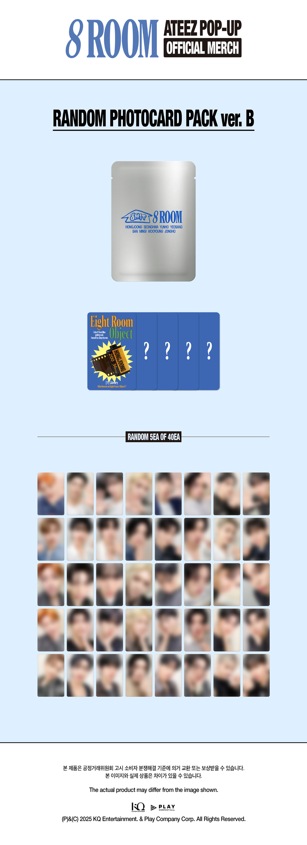 ATEEZ - 8 ROOM POP UP MD - RANDOM PHOTOCARD PACK VER. B Ajouter à My Favorites NOTE IMPORTANTE : CE PRODUIT NE SERA PAS DISPONIBLE POUR NOËL 2025Merci de passer 2 commandes DIFFÉRENTES afin de recevoir vos AUTRES articles pour les fêtesATEEZ - 8 ROOM POP UP MD - RANDOM PHOTOCARD PACK VER. BMerch OfficielSortie Officielle 06 Janvier 2026 en Corée Du SudRéception prévue MI/FIN JANVIER 2026 en France (date susceptible d'être modifiée)Vous soutenez vos artistes préférés avec TAIYOU ! En Précommande Jusqu'au 06/01/2026 Vendu et expédié par TAI YOU En savoir plus sur la livraison Quantité : Ajouter au panier Artiste : ATEEZProduit : 8 ROOM POP UP MD - RANDOM PHOTOCARD PACK VER. BSortie Officielle : 06/01/2026Contenu : - 5 Photocards (aléatoire parmis 40) Edition : CoréenneLangue : CoréenneType : Merch Officiel Votre article a bien été ajouté au panier Quantité : × Partager et faites découvrir cet article par mail Vous souhaitez faire connaître ce produit à vos ami(e)s ?Inscrivez simplement leurs noms, prénoms, e-mails et votre message d'accompagnement.Ils pourront ainsi venir directement sur la page que vous avez sélectionnée. Nom(s) et/ou prénom(s) de vos ami(e)s E-mail de vos ami(e)s Votre nom et/ou prénom Votre E-mail Votre message d'accompagnement (1000 caractères maximum) : Nombre de caractères restants : Ne remplissez pas cette case × Me prévenir lorsque le stock sera réapprovisionné Mon e-mail