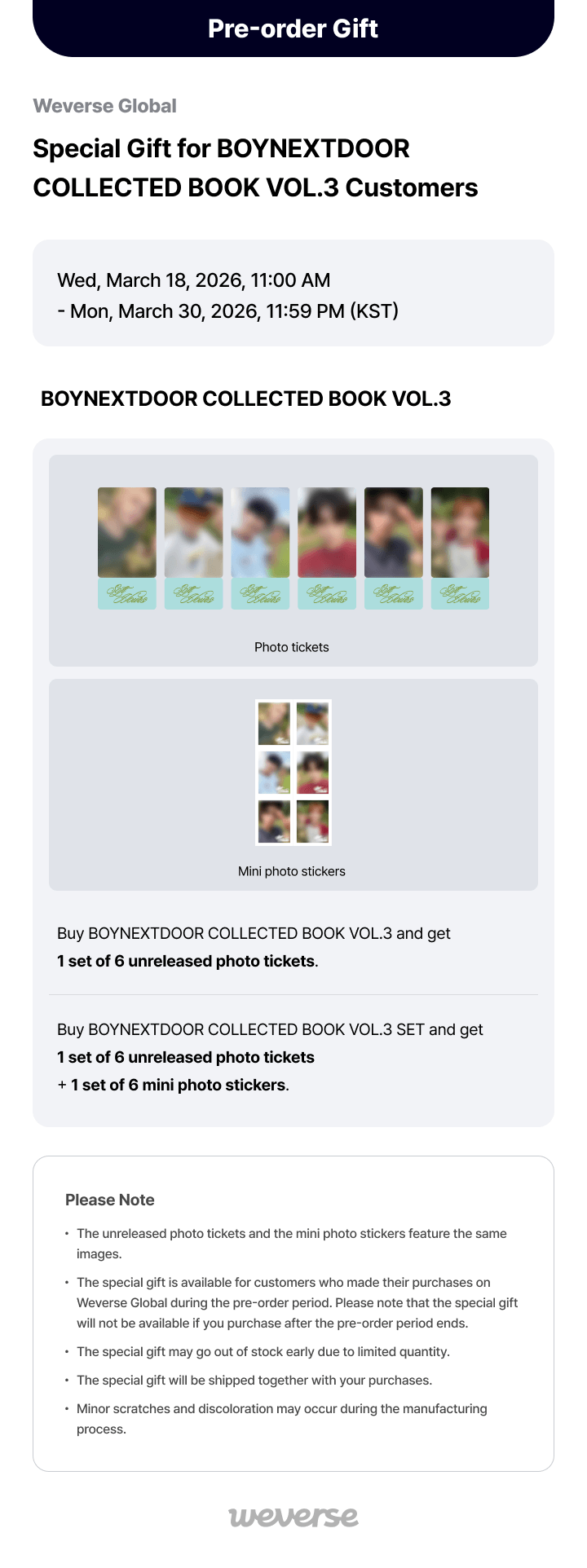 [BONUS WV] BOYNEXTDOOR - Collected Book Vol.3 Ajouter à My Favorites BOYNEXTDOOR - Collected Book Vol.3Photobook+ 1 Set de photos exclusives inclus (Weverse Shop)Sortie le 31 Mars 2026 en Corée du SudLes sorties des albums avec un bonus exclusif sont plus tardives.Réception prévue aux alentours de mi Avril 2026 en France.Vous soutenez vos artistes préférés avec TAIYOU En Précommande Jusqu'au 31/03/2026 Vendu et expédié par TAI YOU En savoir plus sur la livraison Quantité : Ajouter au panier Artiste : BOYNEXTDOORProduit : Collected Book Vol.3Sortie Officielle : 31/03/2026Details :- 1 Photobook (240 pages)- 1 Set de 6 Stickers- 1 Set de 6 posters- 1 Set de 6 Photocards + EnveloppePhotocard Event (Weverse Shop) :- 1 Set de 6 photos ticket exclusivesEdition : CoréenneLangue : Coréenne Votre article a bien été ajouté au panier Quantité : × Partager et faites découvrir cet article par mail Vous souhaitez faire connaître ce produit à vos ami(e)s ?Inscrivez simplement leurs noms, prénoms, e-mails et votre message d'accompagnement.Ils pourront ainsi venir directement sur la page que vous avez sélectionnée. Nom(s) et/ou prénom(s) de vos ami(e)s E-mail de vos ami(e)s Votre nom et/ou prénom Votre E-mail Votre message d'accompagnement (1000 caractères maximum) : Nombre de caractères restants : Ne remplissez pas cette case × Me prévenir lorsque le stock sera réapprovisionné Mon e-mail