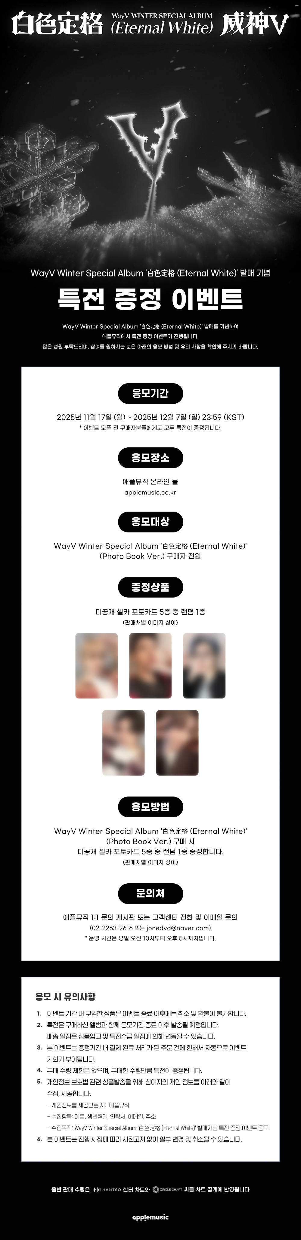 [POB AM] WayV - 白色定格 (Eternal White) - Winter Special Album (Photobook Ver.) Ajouter à My Favorites WayV - 白色定格 (Eternal White) - Winter Special AlbumVersion Photobook, 2 modèles+ 1 Photocard exclusive aléatoire inclue (apple music)Sortie le 08 Décembre 2025 en Corée du SudNote : La disponibilité pourra être différente en raison des fêtes de fin d'année, retardant certains envois entre la Corée du Sud et la France. Les livraisons ne pourront être garanties à temps avant fin décembre 2025.Merci pour votre compréhensionAUCUN ECHANGE POSSIBLE AVEC DES VERSIONS commandées précédemment Vous soutenez vos artistes préférés avec TAIYOUCharts coréens HANTEO et GAON : Chaque album est automatiquement comptabilisé pour les classements coréens#TMP WayV Choisir... En Précommande Jusqu'au 08/12/2025 Vendu et expédié par TAI YOU En savoir plus sur la livraison Quantité : Ajouter au panier Artiste : WayVProduit : 白色定格 (Eternal White) - Winter Special AlbumSortie Officielle : 08/12/2025Details :- 1 CD- 1 Photobook- 1 Photocarte details à venir...Photocard Event (apple music) :- 1 Photocard exclusive (aléatoire parmi 5 modèles)Edition : CoréenneLangue : CoréenneTracklist :à venir... Votre article a bien été ajouté au panier Quantité : × Partager et faites découvrir cet article par mail Vous souhaitez faire connaître ce produit à vos ami(e)s ?Inscrivez simplement leurs noms, prénoms, e-mails et votre message d'accompagnement.Ils pourront ainsi venir directement sur la page que vous avez sélectionnée. Nom(s) et/ou prénom(s) de vos ami(e)s E-mail de vos ami(e)s Votre nom et/ou prénom Votre E-mail Votre message d'accompagnement (1000 caractères maximum) : Nombre de caractères restants : Ne remplissez pas cette case × Me prévenir lorsque le stock sera réapprovisionné Mon e-mail