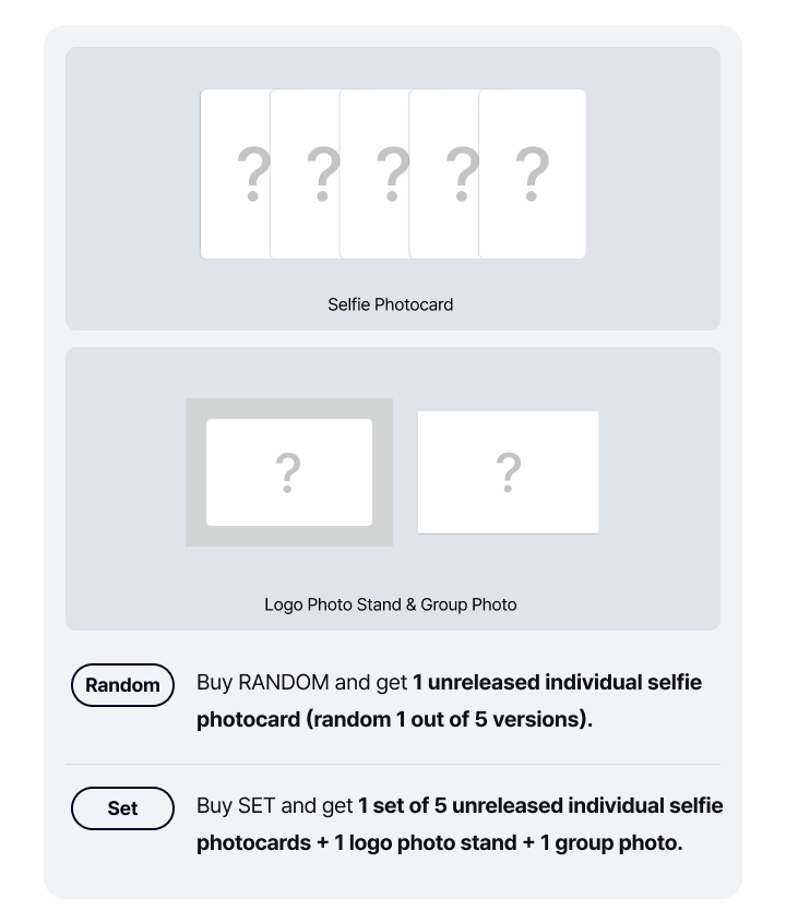 - 1 Photocard ver.1 (aléatoire parmi 5 modèles)