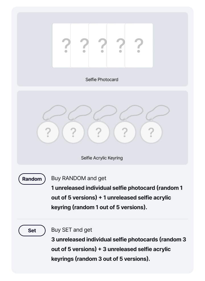 - 3 Photocards selfie (aléatoires parmi 5 modèles)